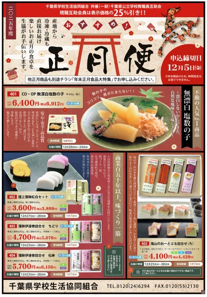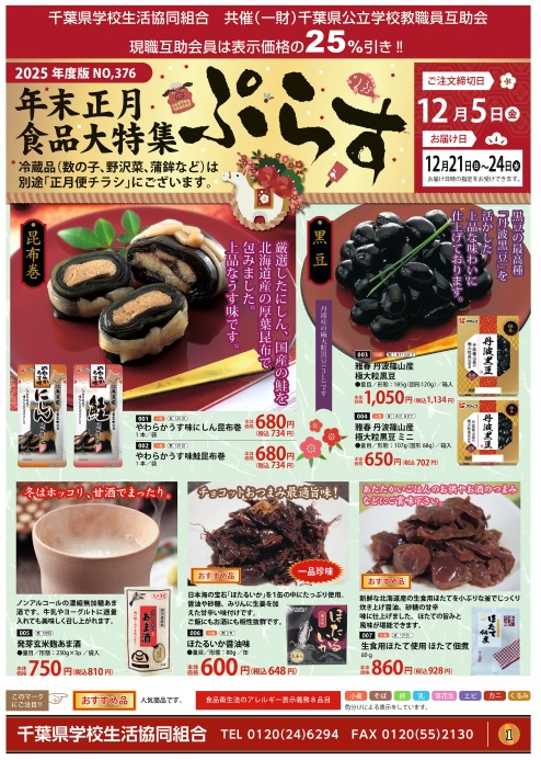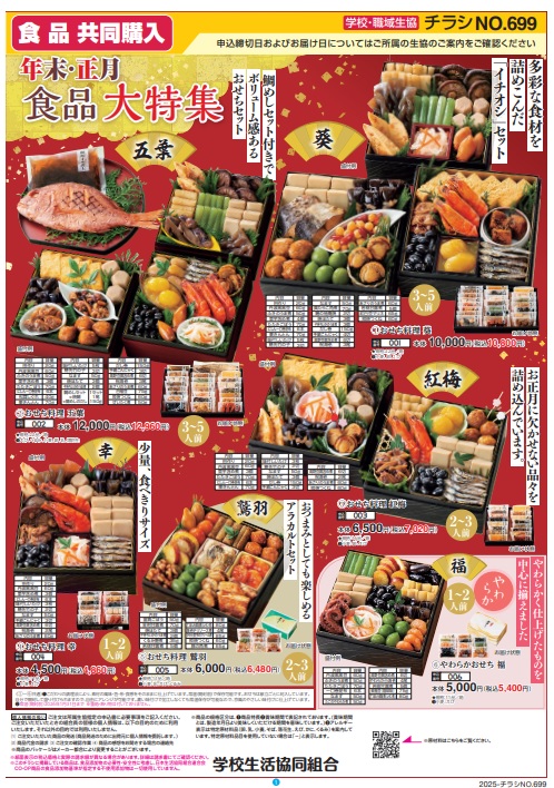 ※こちらは現職互助会員専用カタログです。 ※本カタログは、各所属へ回覧・掲示用カタログと併せて前回ご利用の現職互助会員へ個別に11月17日頃お届けします。 ※現職互助会員以外の方で、カタログご希望の場合は通常価格でのカタログをご案内します。学生協までご連絡をお願いします。 ※「№5025おせち9選」のカタログご希望の方は学生協マイページでの閲覧またはお電話にてご連絡をお願いします。